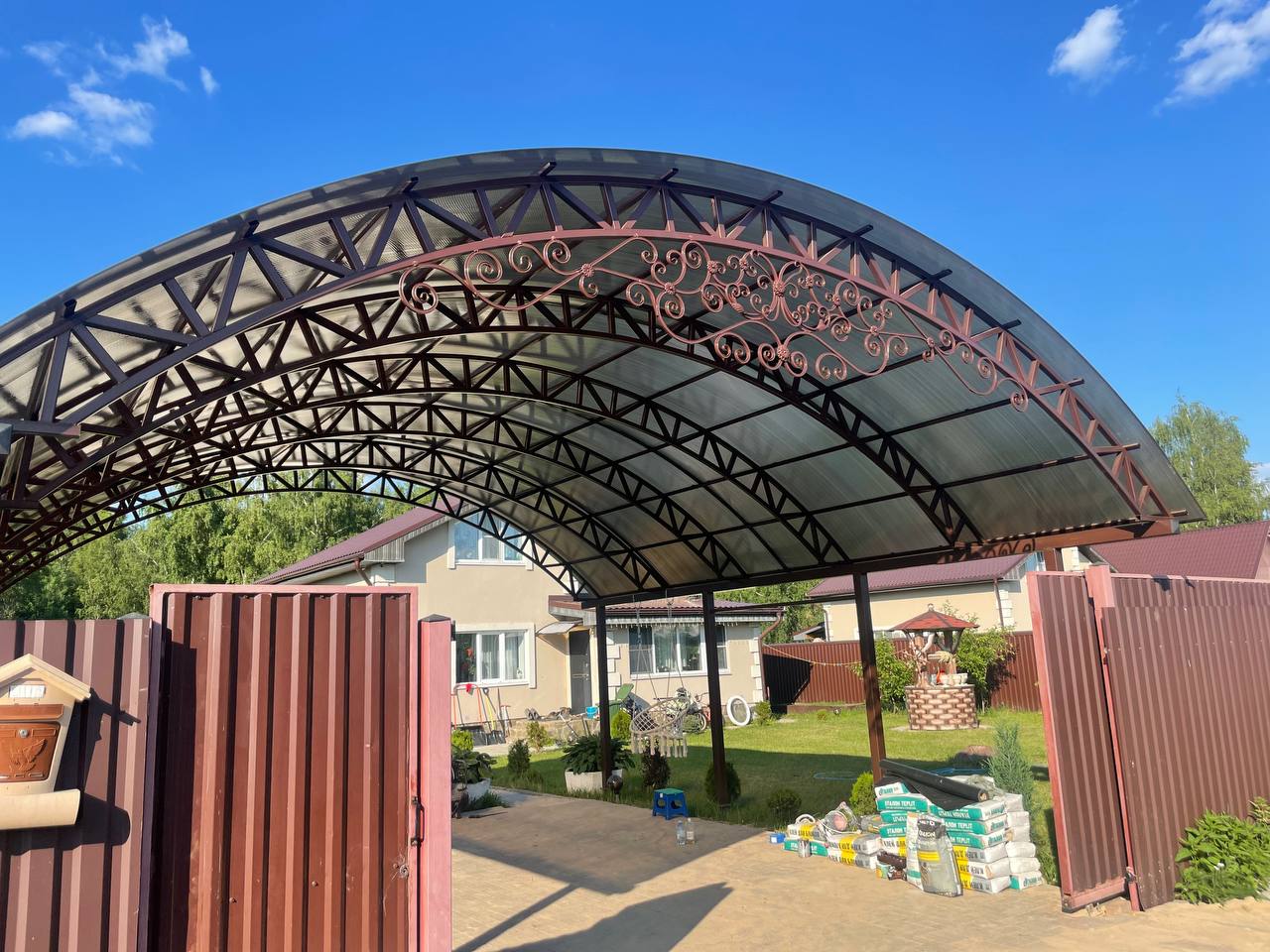 За день на даче изготовили арочный навес 5 на 7 с покрытием поликарбоната. Привезли уже готовые крашенные фермы и весь остальной материал. Все за собой убрали и увезли мусор. Молодцы!